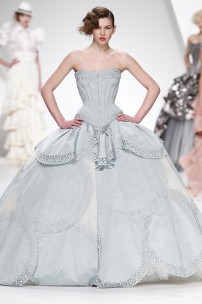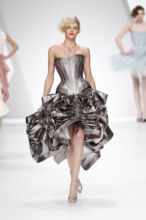 saia de duas camadas; I - saia superior curta e ampla, de camadas de círculos recortados a laser sobrepostos; II - saia inferior longa e ampla com camadas circulares recortadas a laser, comprimento manipulável