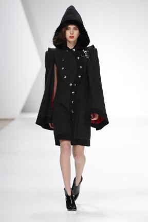 casaco-capa de inspiração militar; capuz amovível; botões metálicos